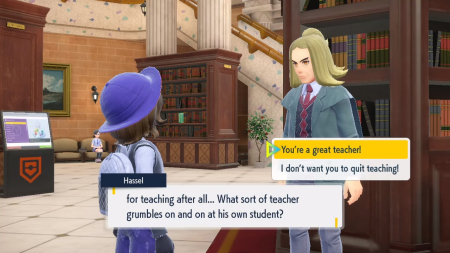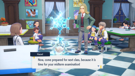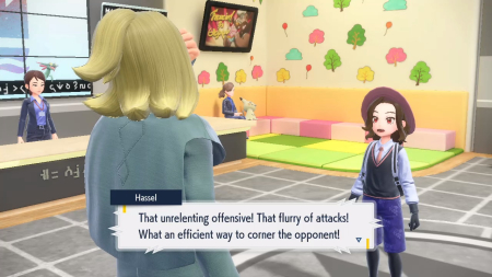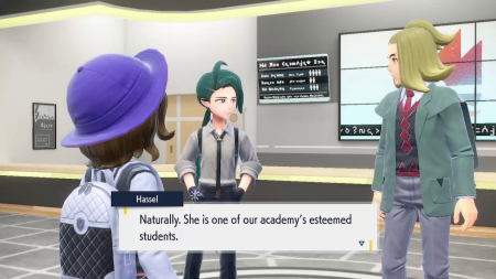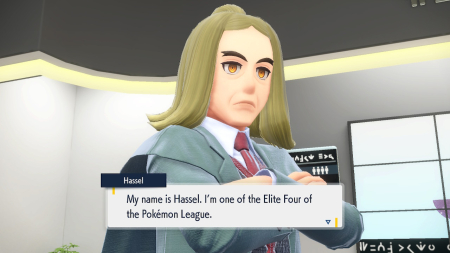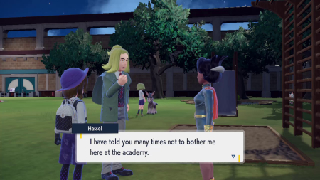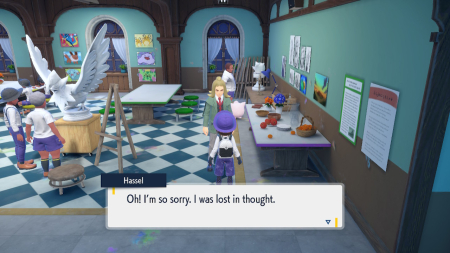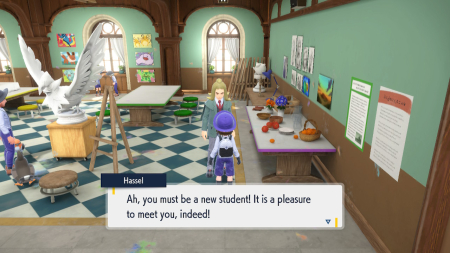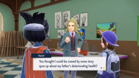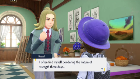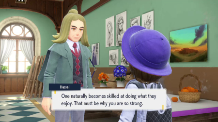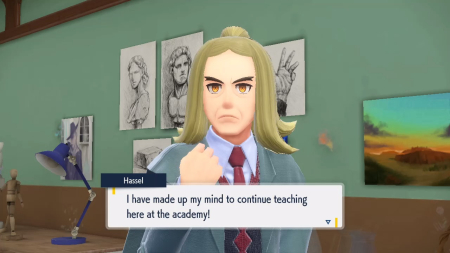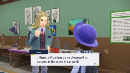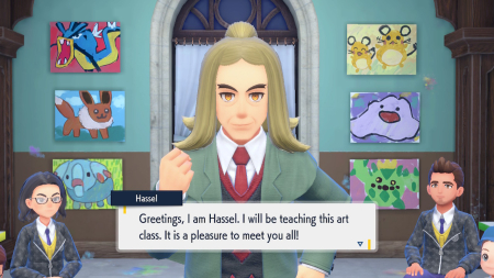 Hassel introduces himself as one of the Paldea Elite Four as well as your art teacher at the academy. He encourages you to train hard if you wish to defeat him during your Champion test, and welcomes you to attend his art classes as well. You do indeed unlock the first art class after this scene.