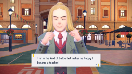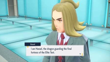 He promises to leave his teacher role behind as he is “the dragon guarding the final fortress of the Elite Test” and comes at you with the full force of his dragon team; Noivern, Flapple, Dragalge, Haxorus and his ace Baxcalibur, which he will terastalize into a pure Dragon type. After sending out his final Pokémon, Hassel turns back into teacher mode for a bit and tells you that you’ve almost passed the “test” and not to give up!