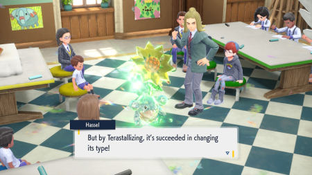 The second art lesson gets a little more practical, as Hassel brings in an assistant: Professor Gible! He asks Gible to terastalize, and asks you to identify which type the Tera Jewel on its head represents, pointing out at the beautiful flowers sprouting in it. (Can you guess?)